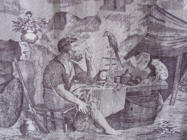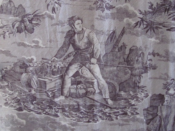 It is Robinson Crusoe a toile ‘from the Christopher Moore Toile Collection’. It is very delicate and pleasing. I have also pinned some over an ugly door into my study and even, believe it or not, made some covers for my completely utilitarian desk chair. (I’m aware you can ‘over-toile’. Next thing my kitten will be wearing a toile poke-bonnet and kick-skirt.)