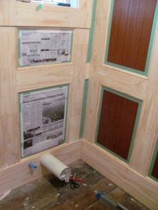With Michael’s job done, it was up to me to paint the panelling. Never in my life have I been so pedantic about masking tape. Each mahogany panel was carefully masked off and then a sheet of newspaper taped over that and the edge sealed again.