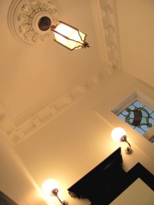 Heraldic windows seemed to need an aristocratic ceiling. I decided to try fibrous plaster for the first time. I’d read in World of Interiors years ago, someone recommending that a small room requires large pieces of furniture and emphatically scaled details. So I went straight to Cararra ceilings – whose moulds date from the Titanic period and were used in big commercial buildings (At the same time I purchased the largest pedestal basin in Duravit’s 1930 range).