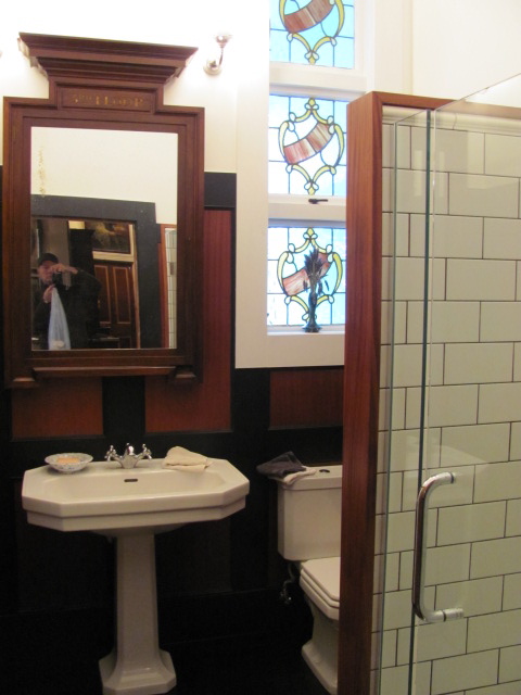 I don’t really recall now how we settled on the theme for the decoration of the bathroom. What we wanted was something masculine, luxurious, woody and with essentially Edwardian overtones. This came to be referred to as the ‘first class men’s bathroom on the Titanic.’