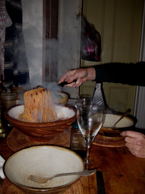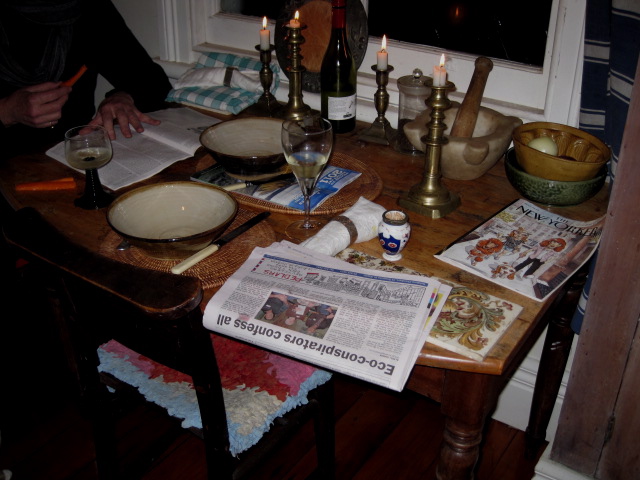 Ours is a small kitchen, a very small kitchen by contemporary standards, but it’s made minute by its new dual use as a dining room and kitchen. There is however something appealing about the intensity of our new cooking/eating arrangement.