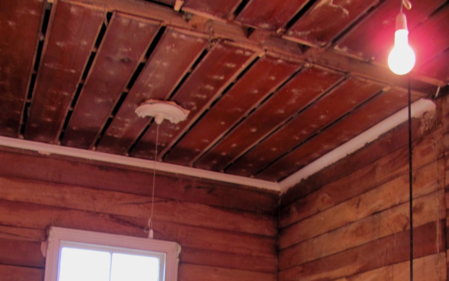 When we demolished the wall between onetime kitchen and maid’s room we discovered that the ceiling planks were not continuous (and the battens long removed). This put an end to the idea of a board and batten ceiling of any authentic type.