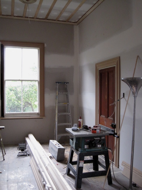 Instead the old cornices were removed (to be put back up later), new gib-board was put up over the old boards to make a new continuous ceiling. Then with the cornice put back, new battens were laid over. Because the room is long and slender what was two rooms look very much like it always was.