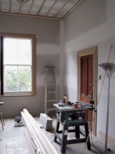 Similarly the wall finishes of the two room – both different – were covered with new wallboard. A quick assessment of doors and windows – led to a slight shift of one door to the left by a few feet, this was more to accommodate the layout of the room that leads off the new room. Now the only suggestion that there were ever two rooms are remnant lines on the old wooden floor – and these will be covered by carpet.