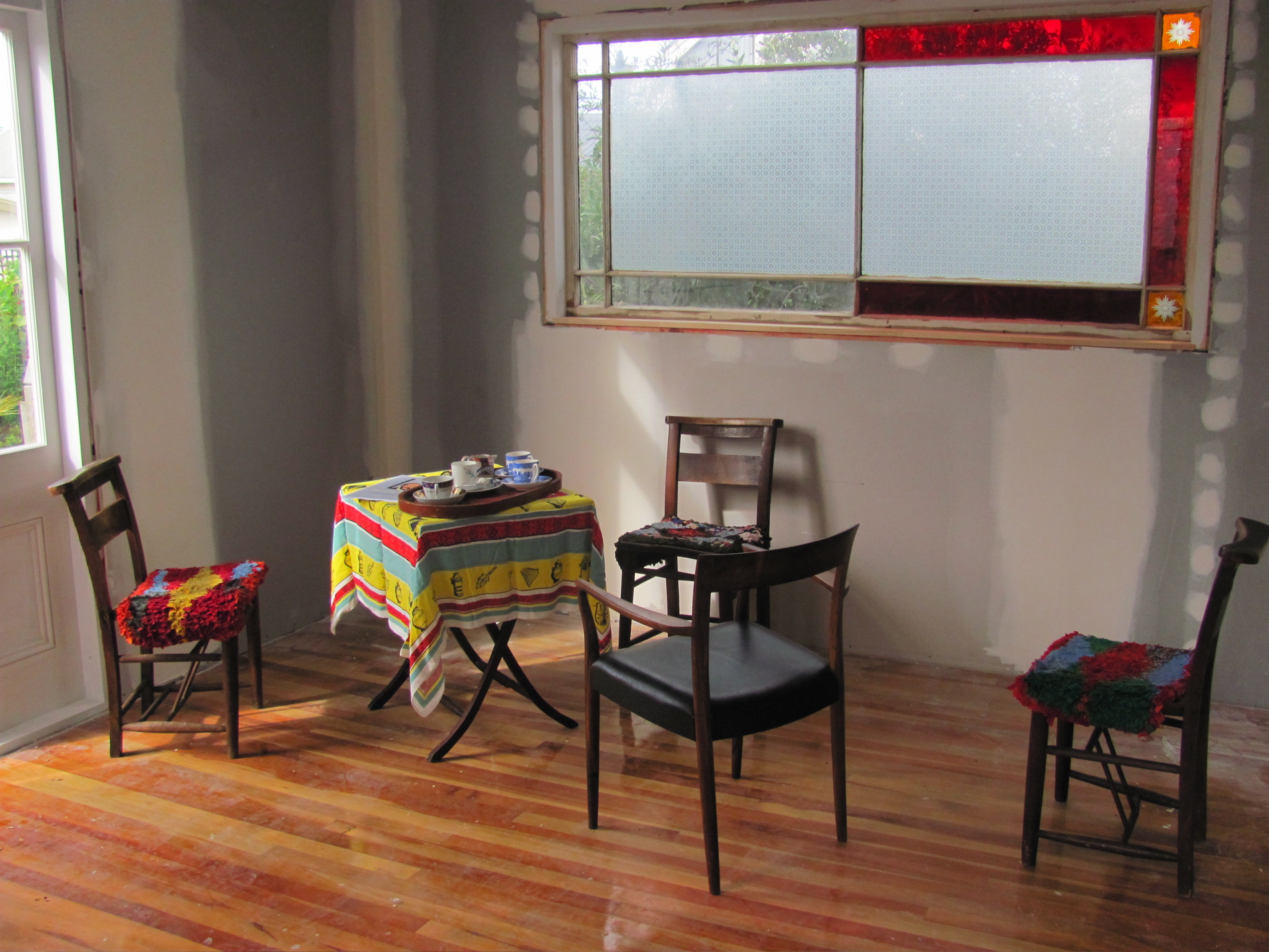 Somehow we decided the sun room aka back dining room would have coloured glass windows. This was partly because we had haphazardly collected old Victorian windows and now had to justify these fevered purchases. But the idea of a kind of conservatory seemed pleasing. There were neighbours on one side we could tactfully edit out – and the fact is Victorian glass is pretty glorious.