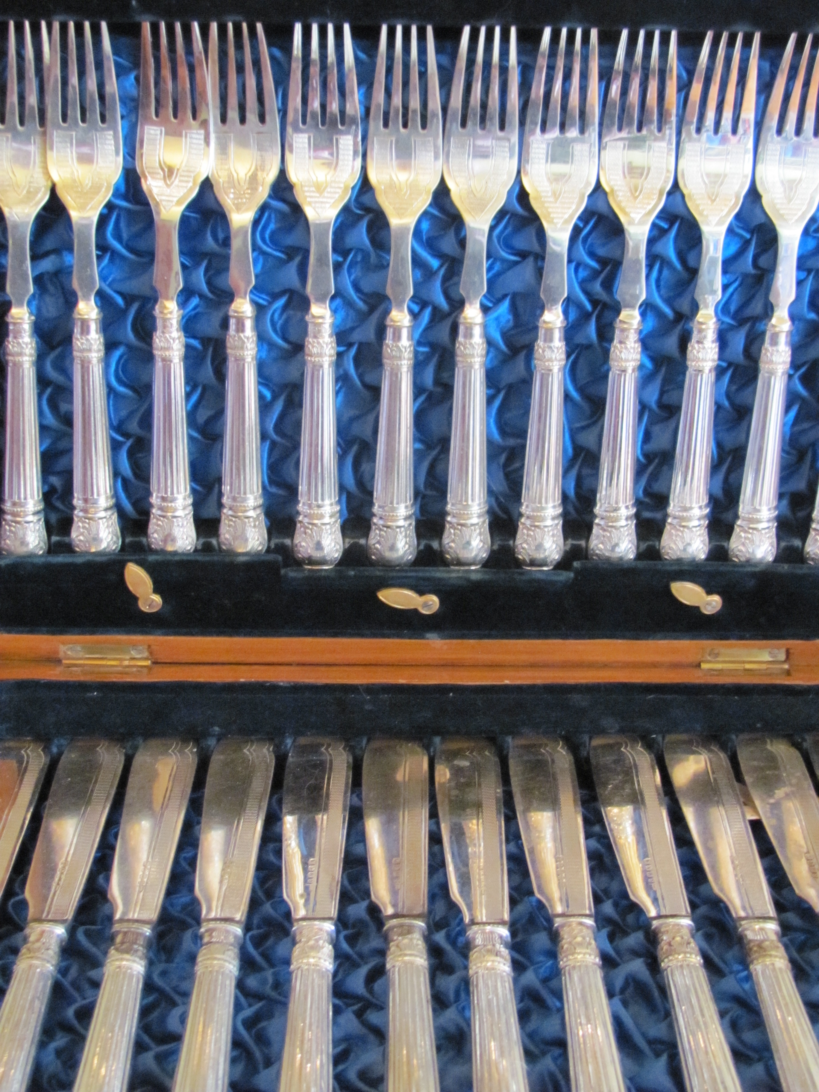 I put out a nice clean damask tablecloth. I went into the plate room: I selected a modest but sparkling Edwardian dinner service – pale white, gold and navy blue. I got out the fish knives and forks, which had once been owned by Eric Mareo, the notorious orchestral-leader/murderer whose wife was having an affair with the fabulous I danced-nude-painted-in-gold lesbian icon Freda Stark.