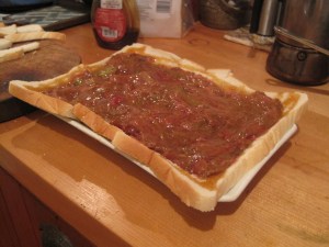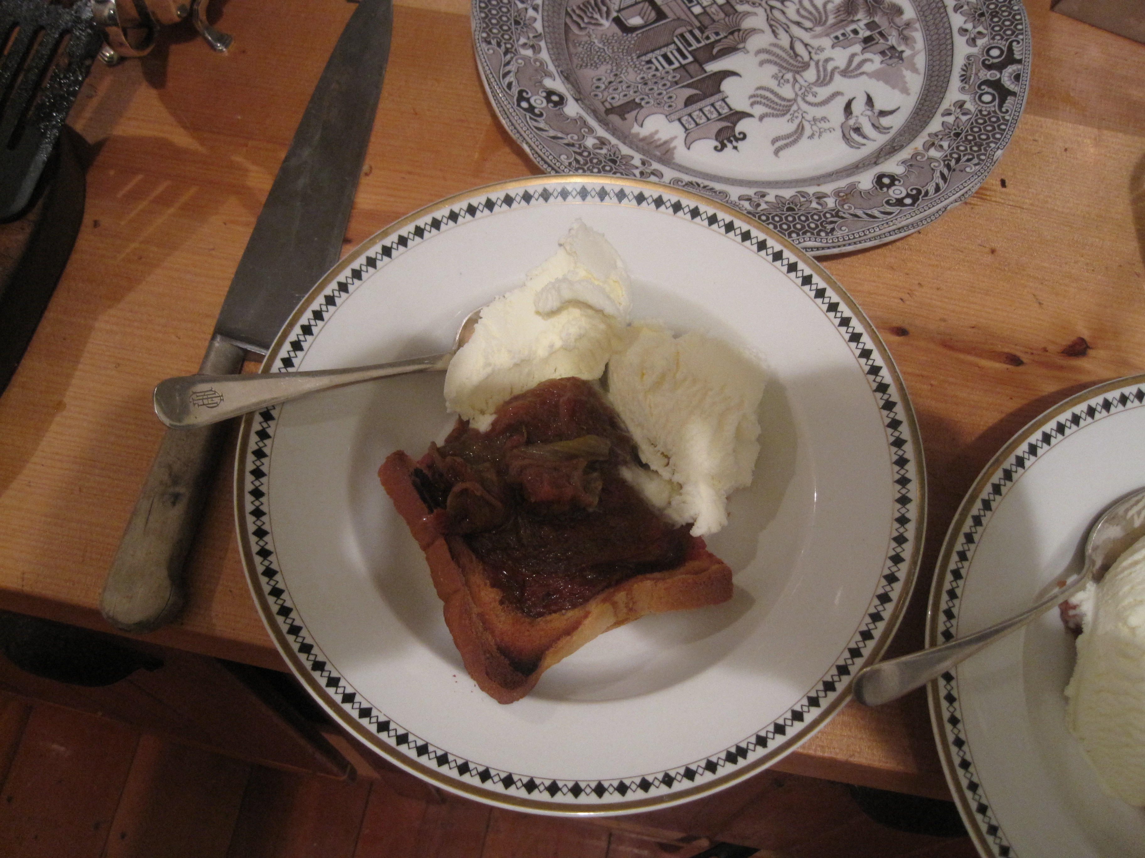 Smear a dish with treacle (golden syrup will do and at the moment I’m using maple syrup). Then place on layers of white bread spread with butter. Fill centre with partially cooked and sweetened rhubarb. Place more bread and butter on the top (or go topless like the one illustrated) Put in a hot oven for 15 minutes. Turn out onto a dish (or not) and serve with custard or ice cream.