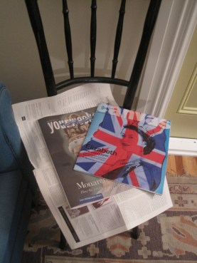 First there was the long-term hallway shrine with open book and iconic image and then the casual shrine made of the newspaper supplements on the Thonet chair. Between constructions there is much to worry about – will boats collide in the Thames armada, which coaches will be used and most pressing of all what jewels will be worn. Then there’s the special jubilee church service to attend and whom do we know with UK TV on Sky?