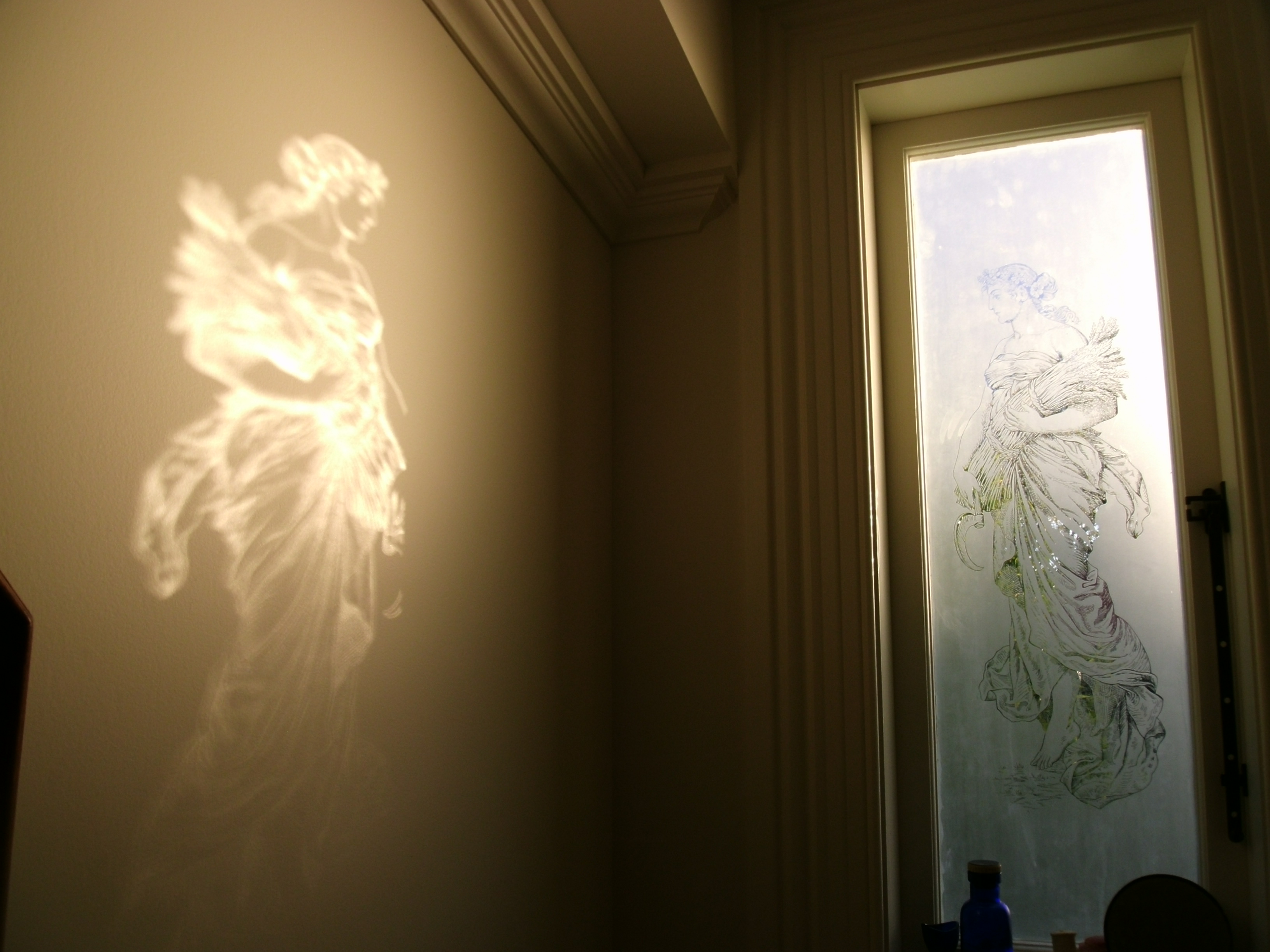 It was in fact a reflection (or was that projection) of the acid-glazed window, which portrayed autumn in the form of a neo-classical young woman, complete with sheaf of wheat, scythe and sandaled feet.