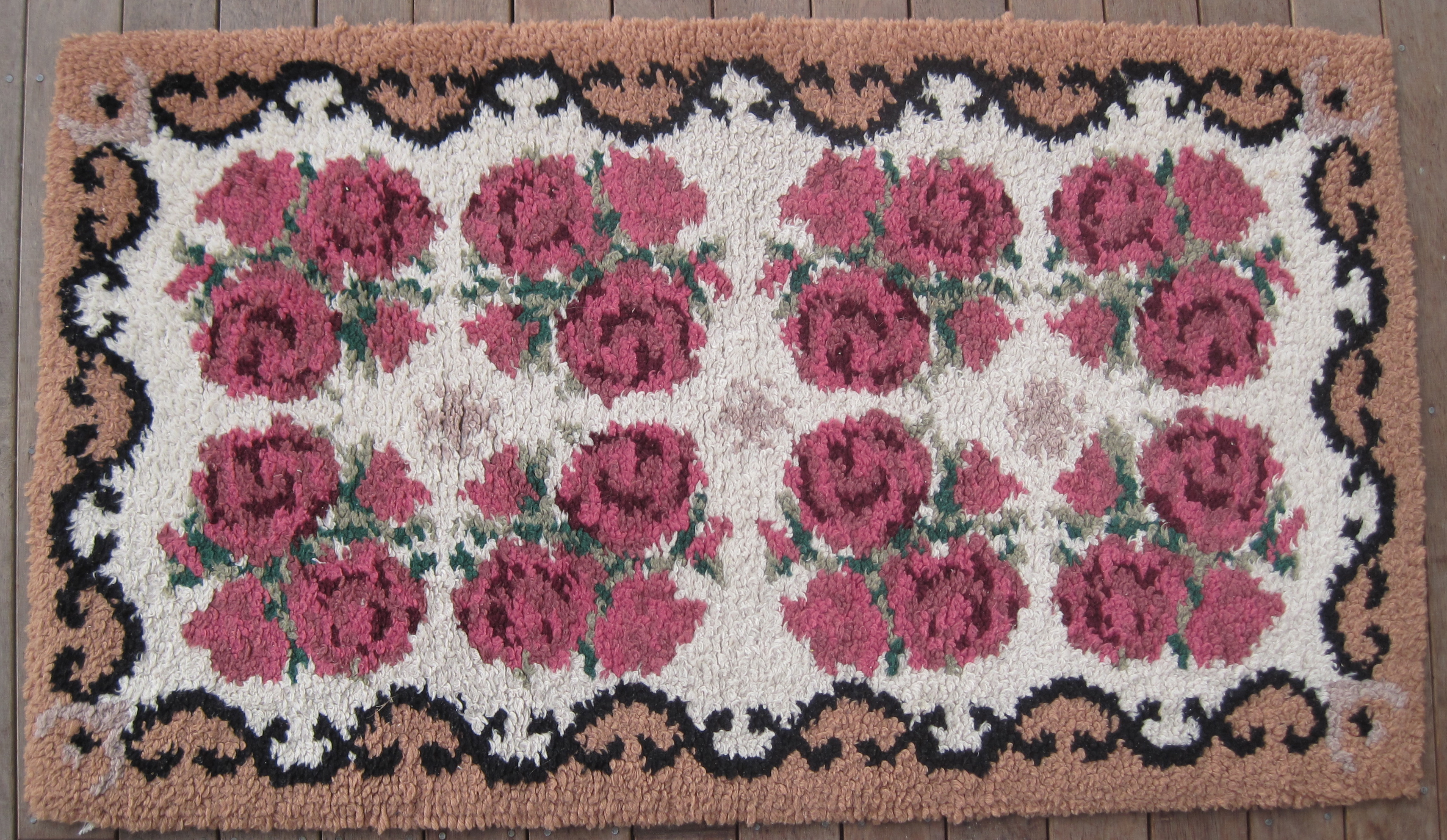 Rag rugs were of course the art form of poorer people. They were made at home and usually occupied kitchen or laundry or bathroom floors. Even if they didn’t start out in those locations they certainly ended up there (or worse in garages or garden sheds). This means that they got engrained with all sorts of muck. At the same time they were tough – and probably did get chucked into laundry tubs and then hung out on the line. however these days rugs like this a reaching retirement age and looking to take things more gently.