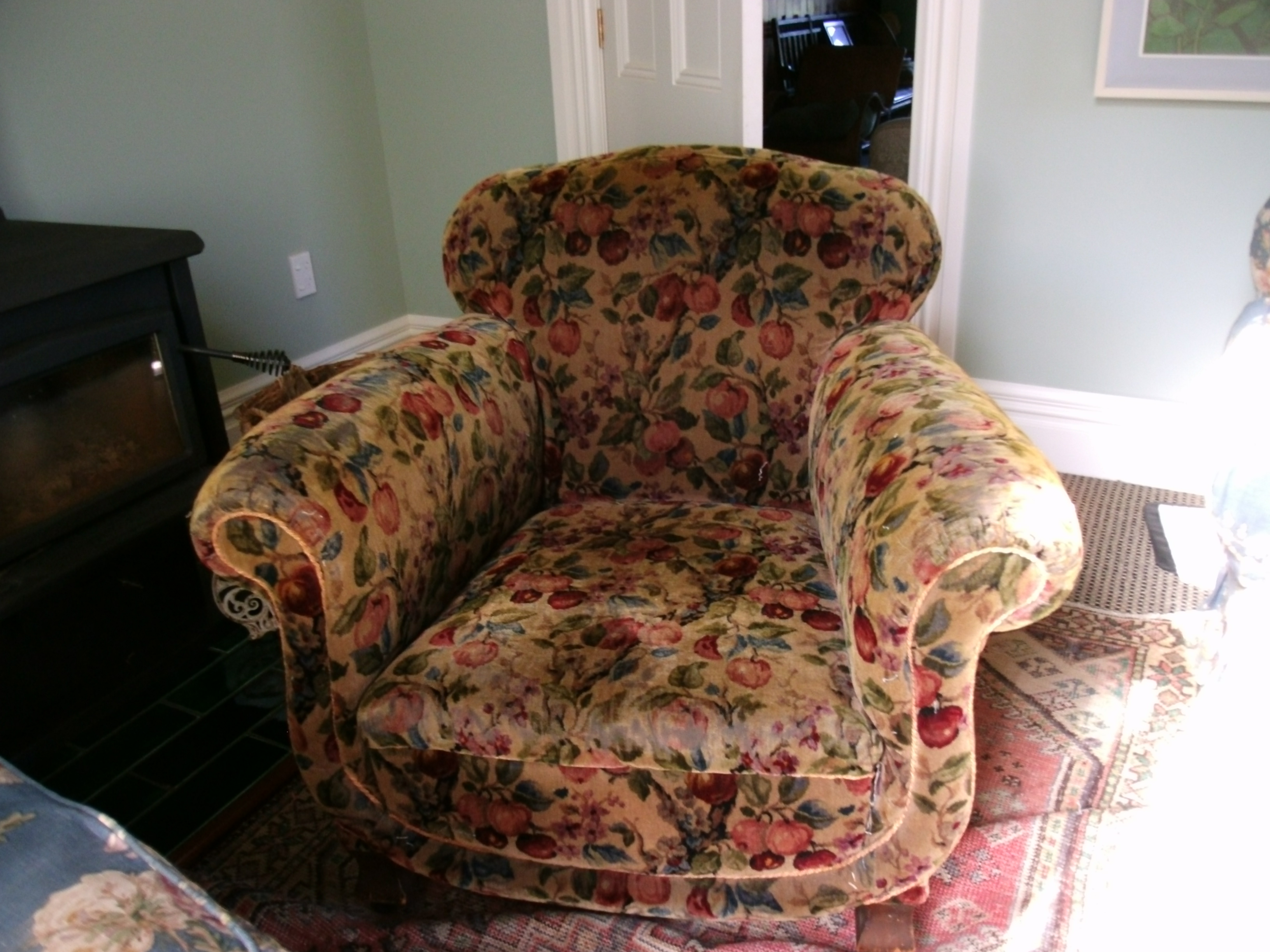 Then, a semi-fabulous couch and two chairs turned up at the auction, covered in blue Sanderson floral linen. It was clearly a couch that had come from an estate sale – something well preserved from a grandmother’s not too often used front room somewhere. The legs were not bare but it had a plump, come-and-sit-on-me, come hither look and enough space for two and the inevitable cat.