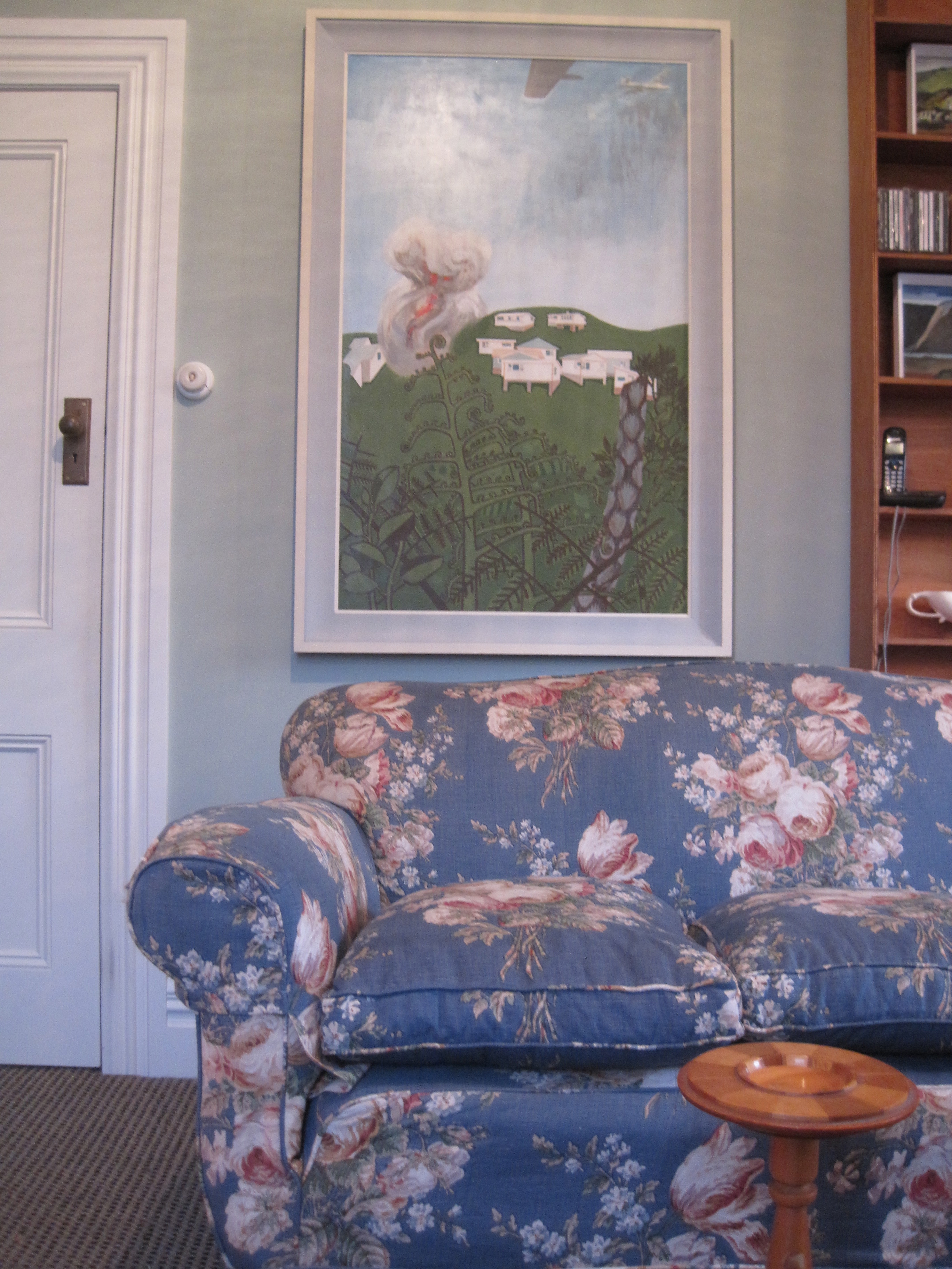 The couch is an excellent fit for the room and very comfortable indeed. The strange grandmotherly covering with its blue background and cozy floral bouquets goes well with the slightly icy green walls and even with the somewhat strange Juliet Peter painting – My Thoughts on Vietnam – in front of which it sits. (This is one of Douglas’s recent modernist purchases – and décor-wise it is all right to match couch and painting as long as you buy the painting first).