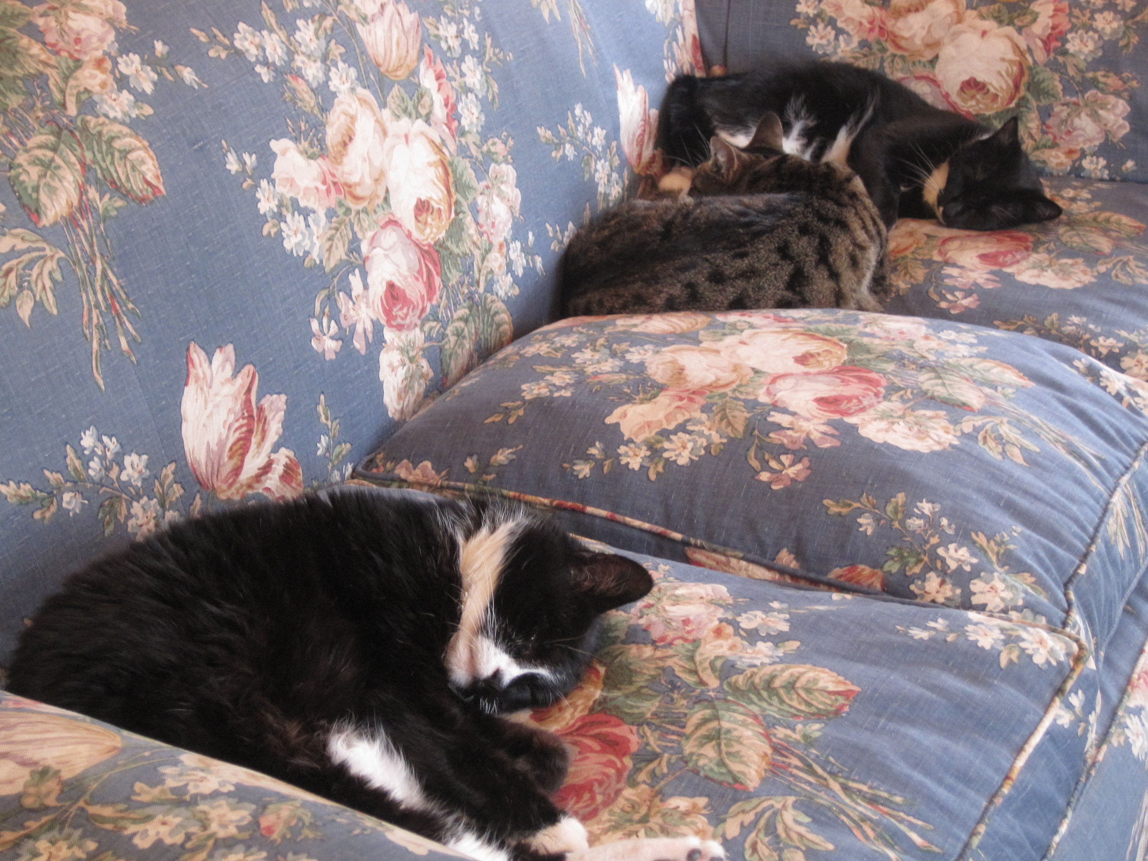 There is a little postscript here. The arms of these chairs have those protective linen coverings which grandparents like. The linen had a little soiled where the hands rest. I asked my close friend Shonagh Koea who is the oracle of household tips and she told me the best way to wash Sanderson linen is in cold water with sunlight soap. As I write this they are drying in the Hawke’s Bay sun – inside out of course to prevent fading – and the cats are curled up asleep on their new couch.