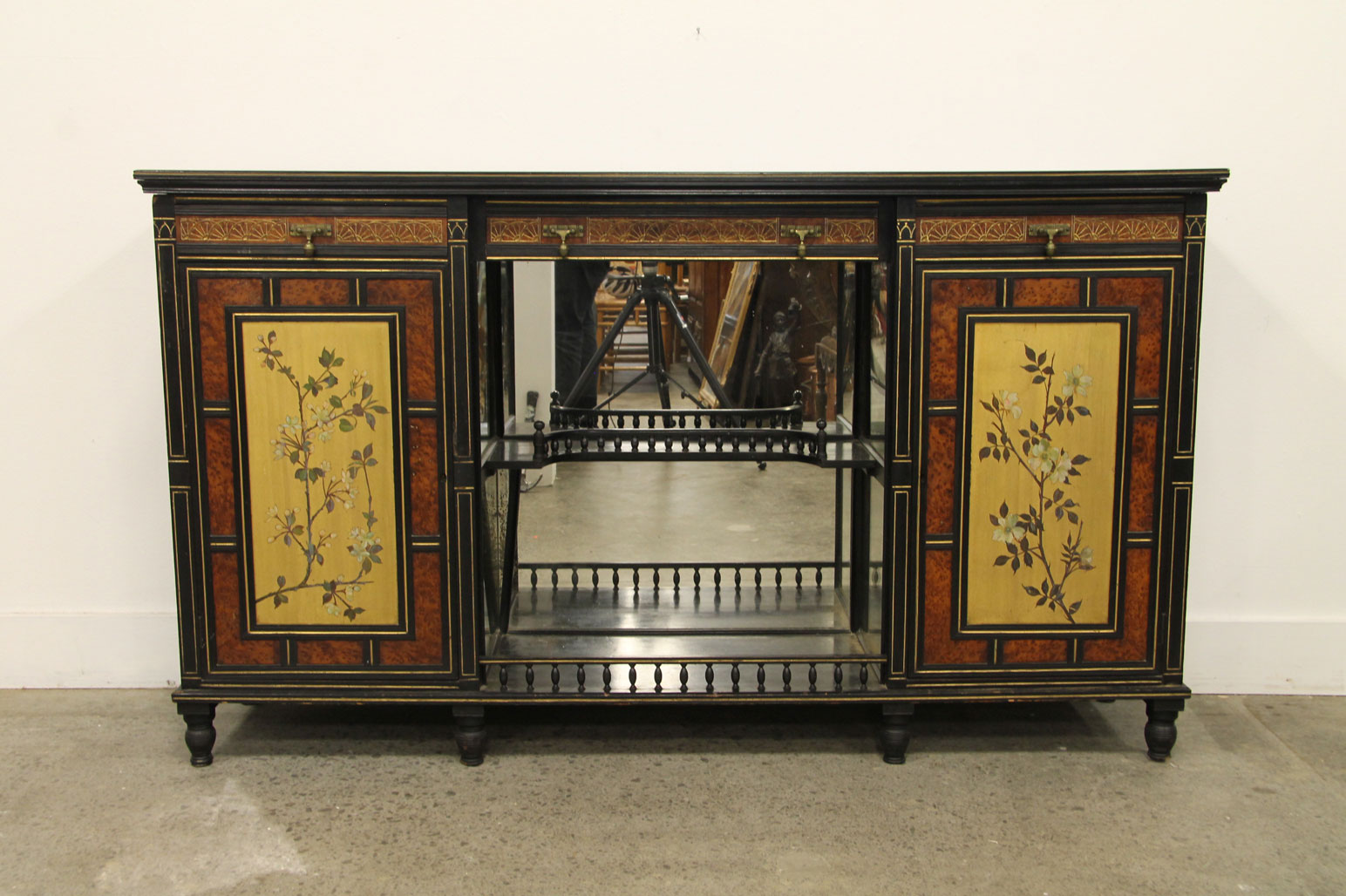 What I like about Heron and Lotus flower is its nod to Aesthetic movement. The Aesthetic movement is a constant presence here. I love its sheer originality. Although inspired by Japanese Art it is madly original and one of the wonders of the Victorian designer’s imagination. We have any number of Aesthetic movement dinner plates and serving dishes but I particularly love Aesthetic movement furniture with its black ebonised finished – highlighted with panels of painted gold. An overmantle in this style hangs over the black painted library fireplace.