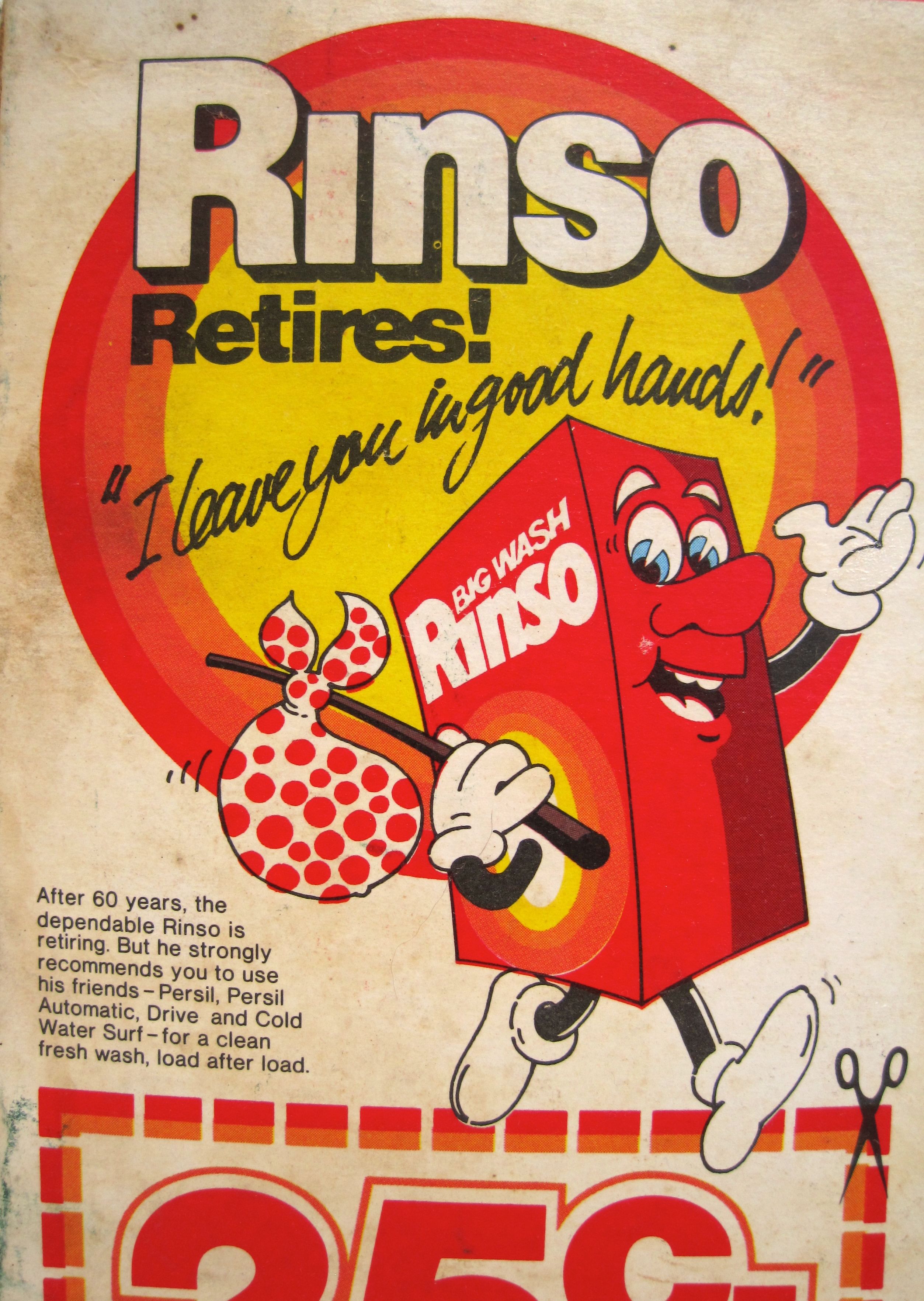 It proclaimed that ‘after 60 years the dependable RINSO is retiring – but he strongly recommends you use his friends ‘Persil, Drive and Cold Water Surf.’ The thing is, by legend these products were duds in the silver-cleaning department. This last ever box of RINSO had probably been bought in a silver cleaning panic once they announced its demise and had been eked out spoonful by spoonful since. The same thing happened some years back when Lever Brothers announced the demise of Sunlight Soap. It survived the big buy up to live another day.