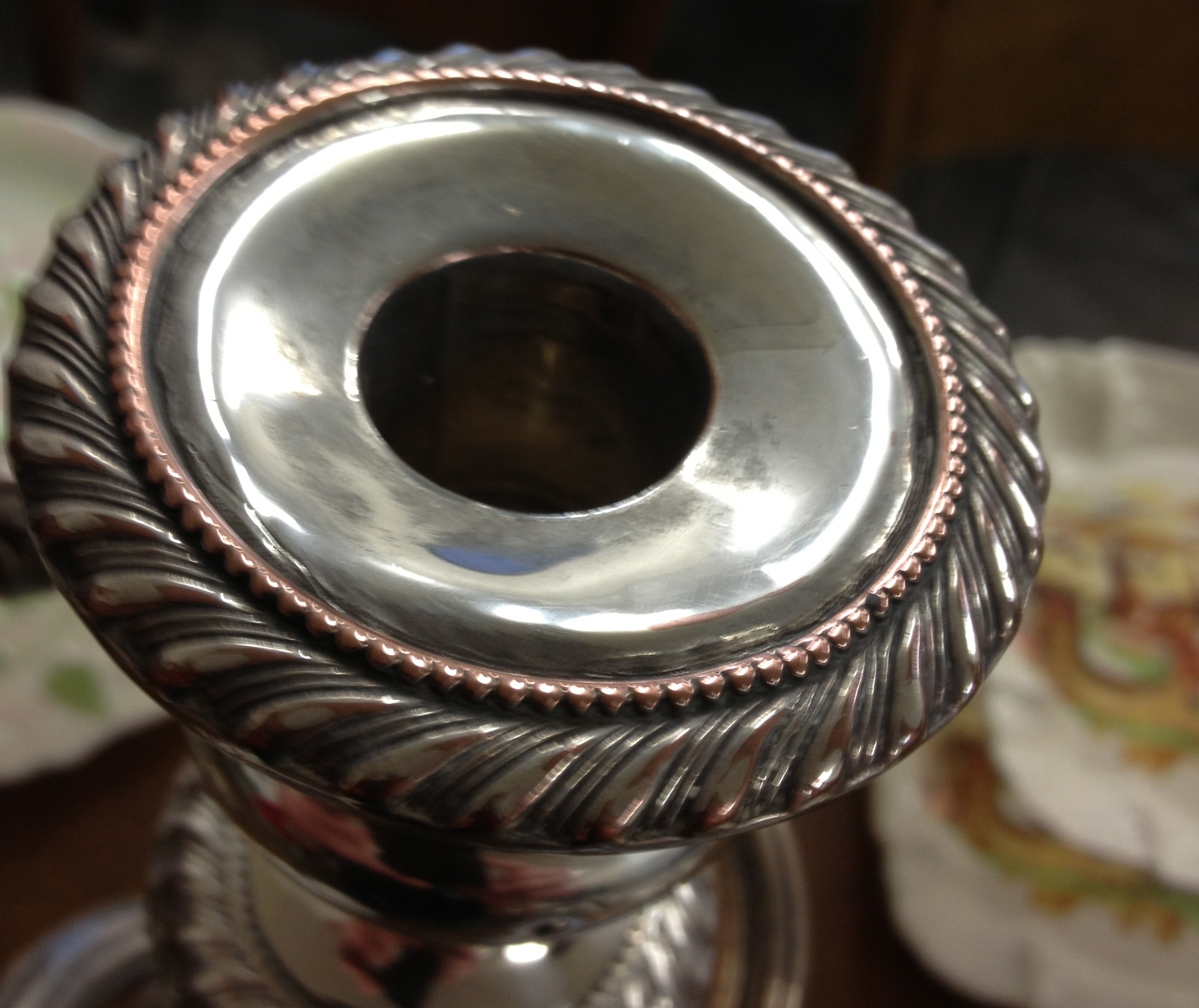 The cellphone picture taken too quickly proved generally useless but did reveal one interesting fact – where the silver had worn away on one of the sconces – copper was showing through. This is generally a sign of age.
